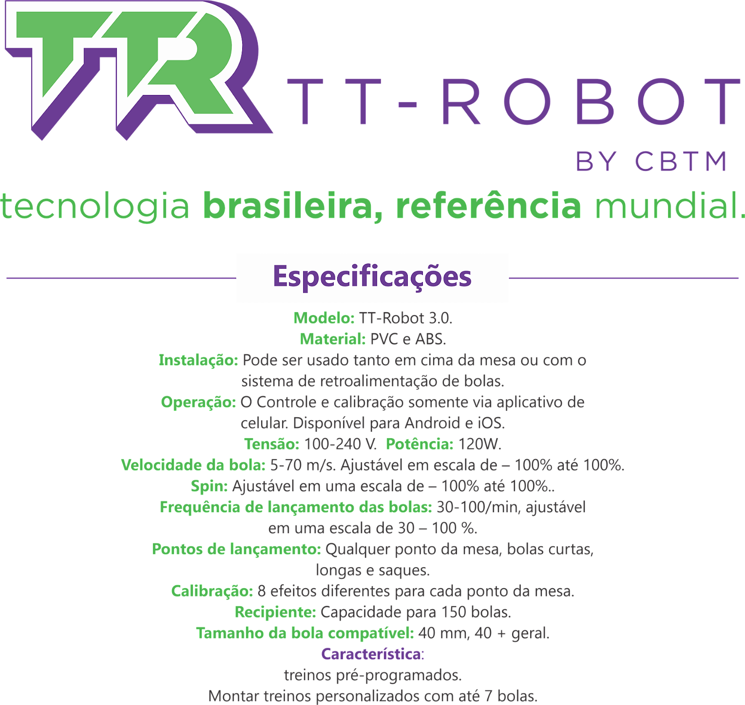 - 1 unidade do TT-Robot by CBTM - 1 unidade do sistema de retroalimentação - 1 Gol aparador de bolas * GARANTIA: 12 meses * Não acompanha bolas.